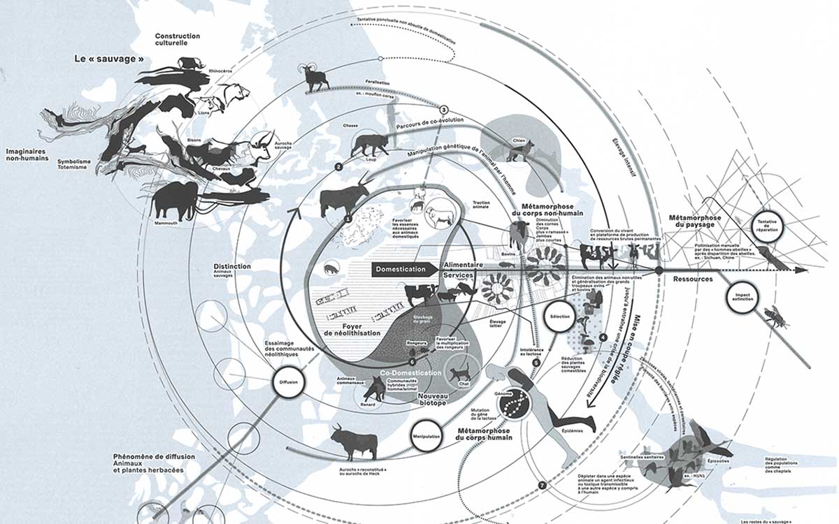 deviendront des troncs construits de façon circulaire incluant sans distinction tous les êtres vivants. Ainsi, les animaux apprivoisés sont devenus des animaux domestiqués obtenant une place parmi les hommes tout en restant « sous la main de l’Homme [d] ». En effet, selon Robert DELORT la domestication est un long processus de mutation dû à « l’intervention de l’homme » et au « confinement des bêtes sauvages » devenant « dépendantes de l’homme » [e]. Ce processus débute dès le Néolithiques avec le loup domestiqué vers 14 000 avant J.-C. qui deviendra plus tard le chien. L’architecte Axelle GRÉGOIRE tente de synthétiser les phénomènes « domesticatoires », comme celui du loup, par un schéma circulaire [53]
