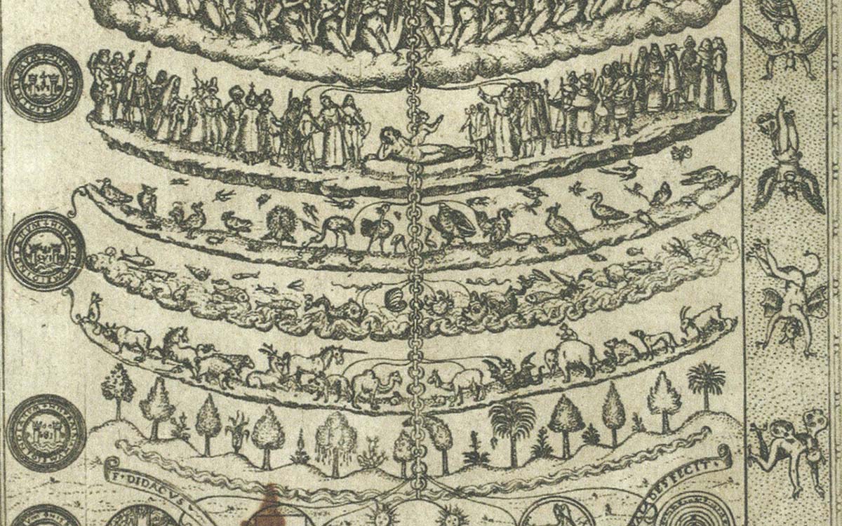 La classification des créatures animales nous a légué un riche héritage visuel et artistique. Selon le biologiste et anatomiste David BAINBRIDGE, cette volonté de classer le vivant a non seulement été animée par un « impératif pratique [b] », mais aussi par une obstination de distinguer l’humain de l'animal. Dès l'Antiquité, des penseurs ont cherché à savoir si l’homme était une exception se distinguant des autres animaux. Il s’agissait de l’âme chez Aristote, puis du rire chez Rabelais ou encore du langage chez Descartes. Plus tard, des zoologues et éthologues (spécialistes de l’étude des animaux) remettront en question ces distinctions : il s'avère que « le chimpanzé rit quand il joue » ou encore que le « passereau chante en patois » [c]. De ce fait, un rapport de supériorité s’est instauré entre l’homme et l’animal que l’on peut observer dans La Grande chaîne des êtres [8]